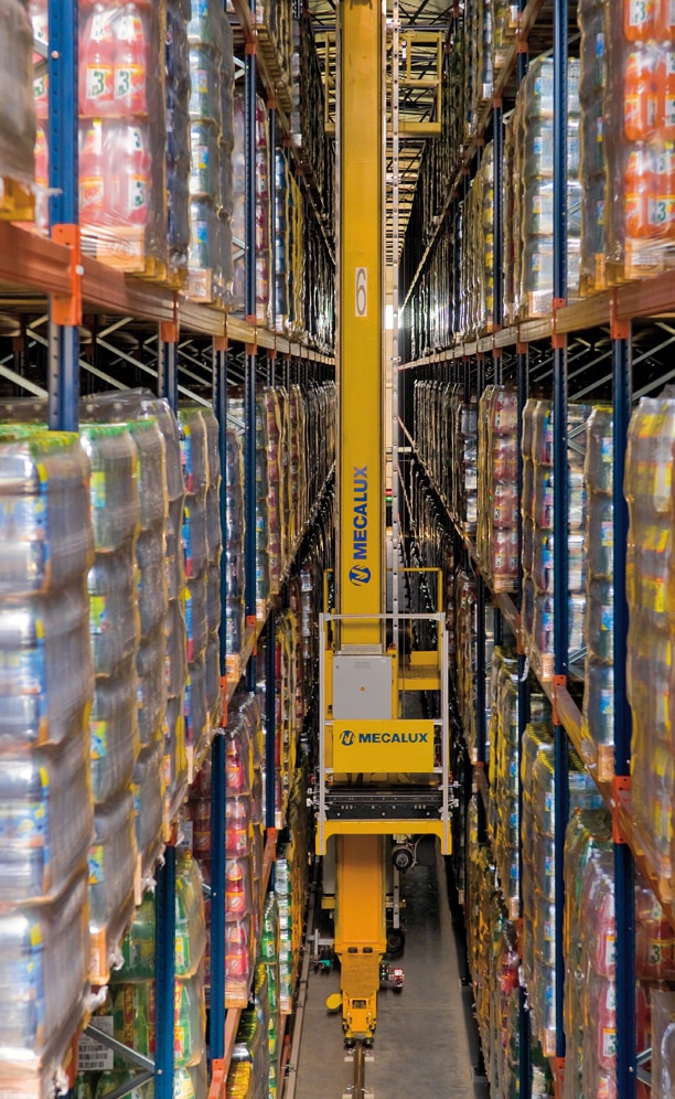 Les rayonnages sont desservis par 11 transtockeurs totalement automatisés qui se déplacent rapidement dans leurs allées et manipulent des palettes dont le poids peut atteindre 1 000 kg.