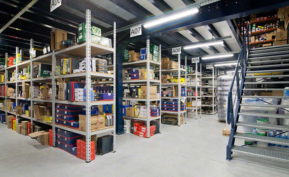 Sur les deux étages de la mezzanine, des rayonnages pour picking de 2,5 m de haut ont été installés. Ces rayonnages se distinguent par leur accessibilité et donc la facilité de manipulation des marchandises.