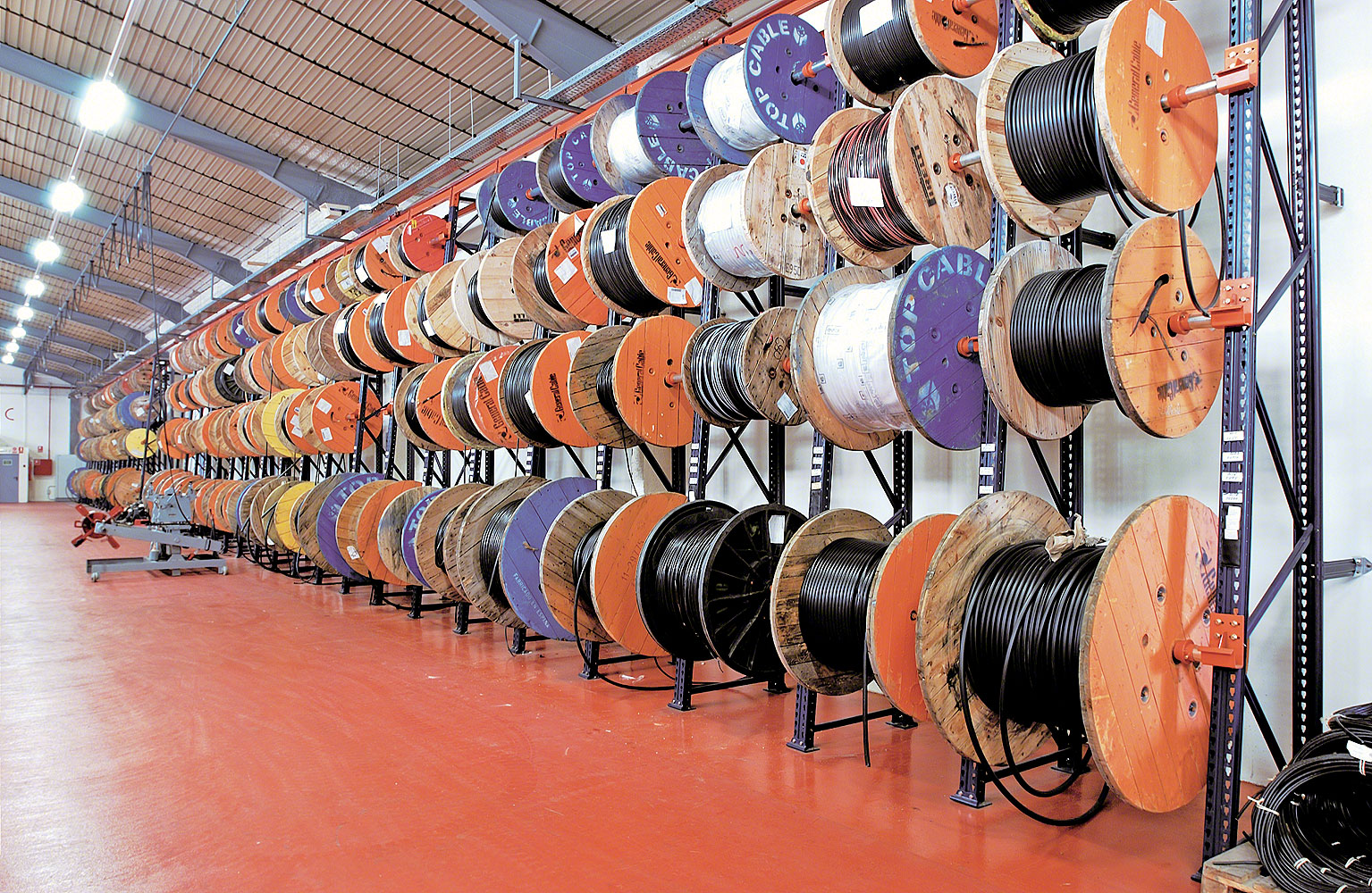 Les bobines sont stockées à l’extérieur, directement au sol, sans poser de problème majeur, mis à part la difficulté d’empiler les charges. Une autre solution pour leur stockage est d’installer des rayonnages conventionnels, à condition que les bobines ne soient pas trop lourdes. Si tel est le cas, elles peuvent être stockées sur des rayonnages similaires à ceux utilisés pour les bobines de tôles. - La solution pour la manutention et le stockage des câbles électriques et téléphoniques est assez différente, car ils sont principalement enroulés sur de grandes bobines de bois (tourets) ou de métal (ces dernières sont désormais plus courantes) constituant une unité de charge – parfois de grandes dimensions – dont la manipulation présente quelques difficultés.