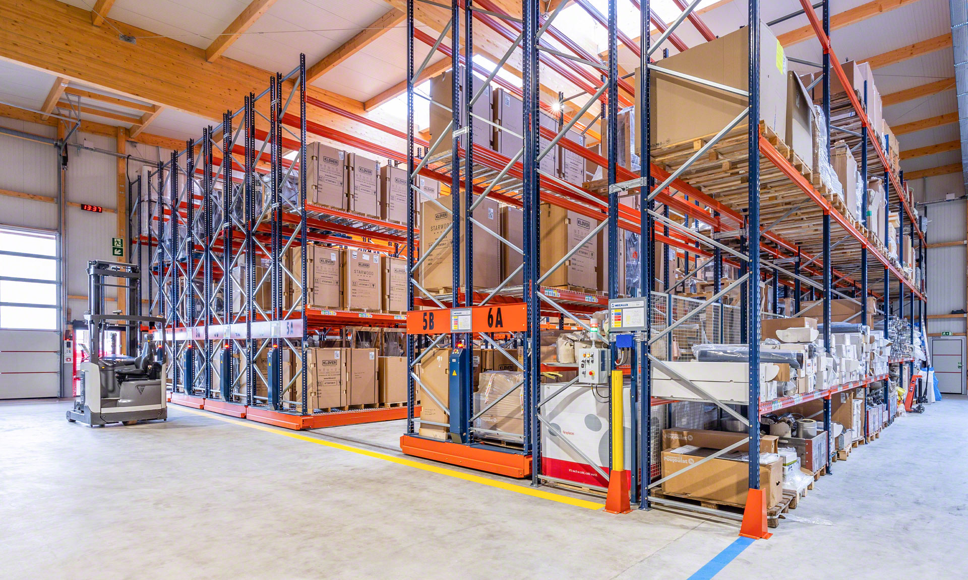 Avec une hauteur de 7 mètres et une capacité de plus de 1000 palettes, les rayonnages sont montés sur des bases mobiles qui se déplacent latéralement sur des rails. Lorsque l'opérateur sélectionne une allée de service à l'aide de la télécommande, les rayonnages s'ouvrent en cascade, de sorte que seule l'allée demandée est accessible. L'accès est ainsi simplifié et la manutention des produits stockés, plus facile.