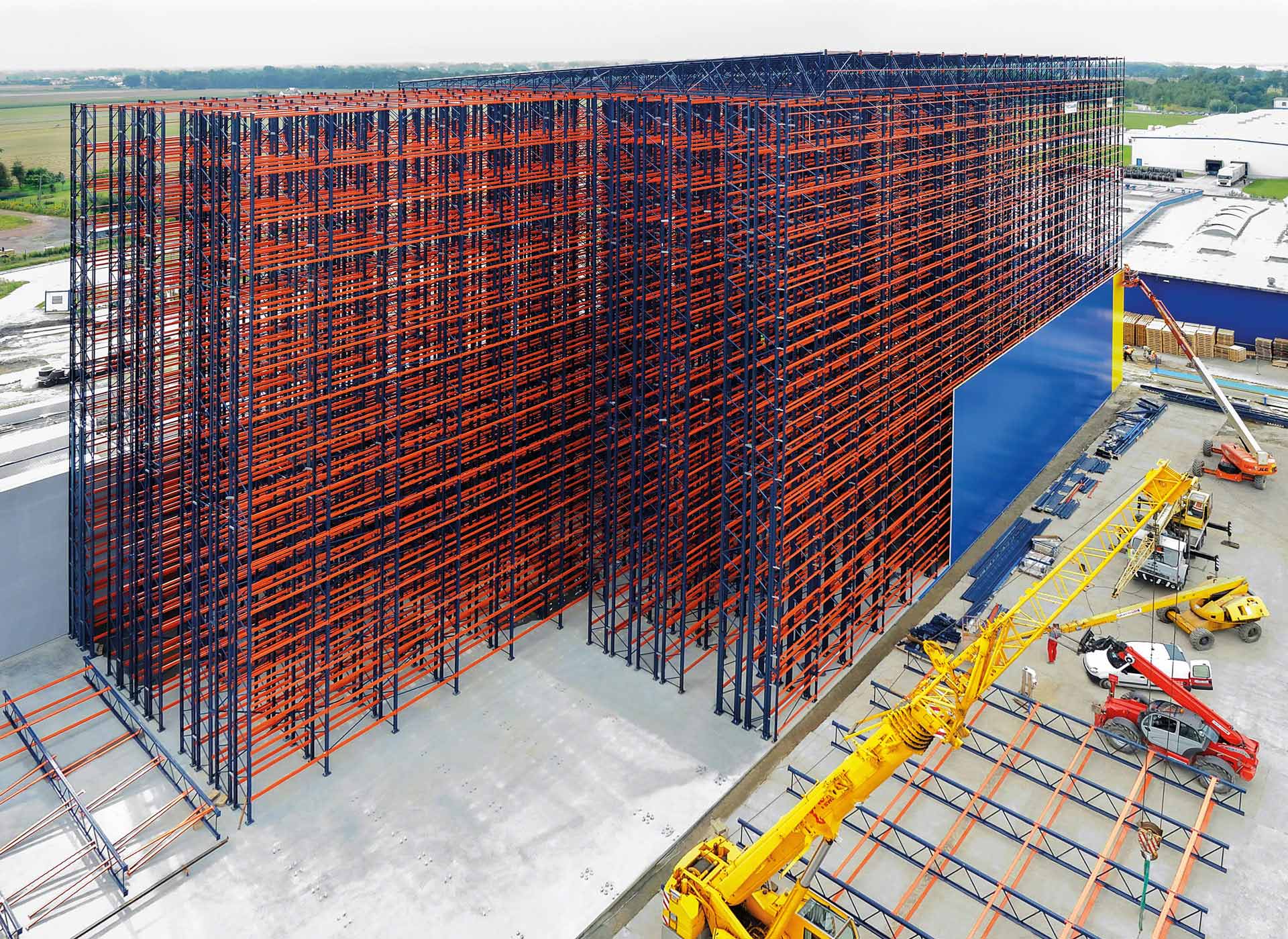 - Stockage grande hauteur : il est possible de construire un entrepôt atteignant 45 m de hauteur, étant donné que les seules limites à la hauteur des racks autoportants résident dans la réglementation et les capacités de levage des équipements de manutention.