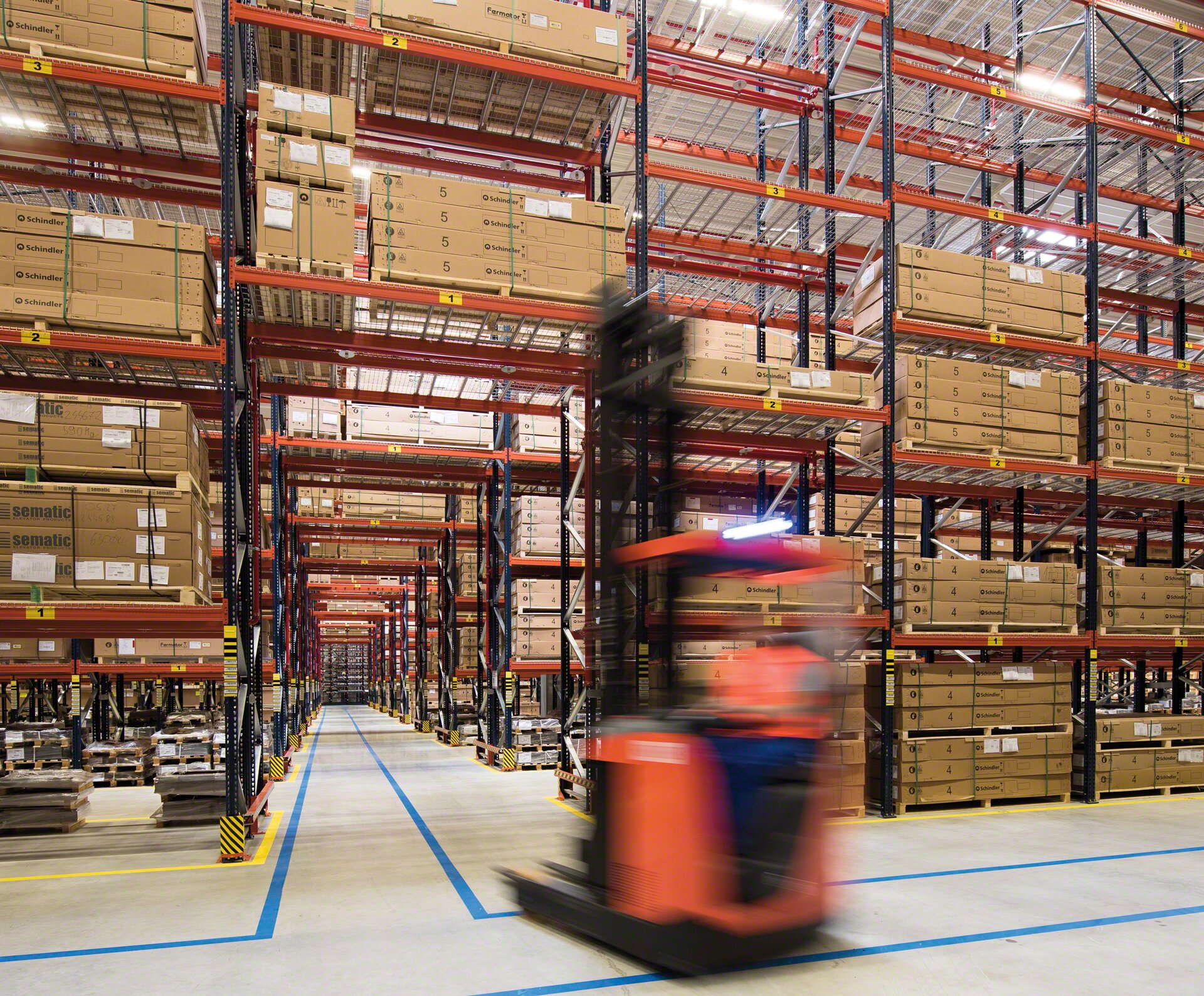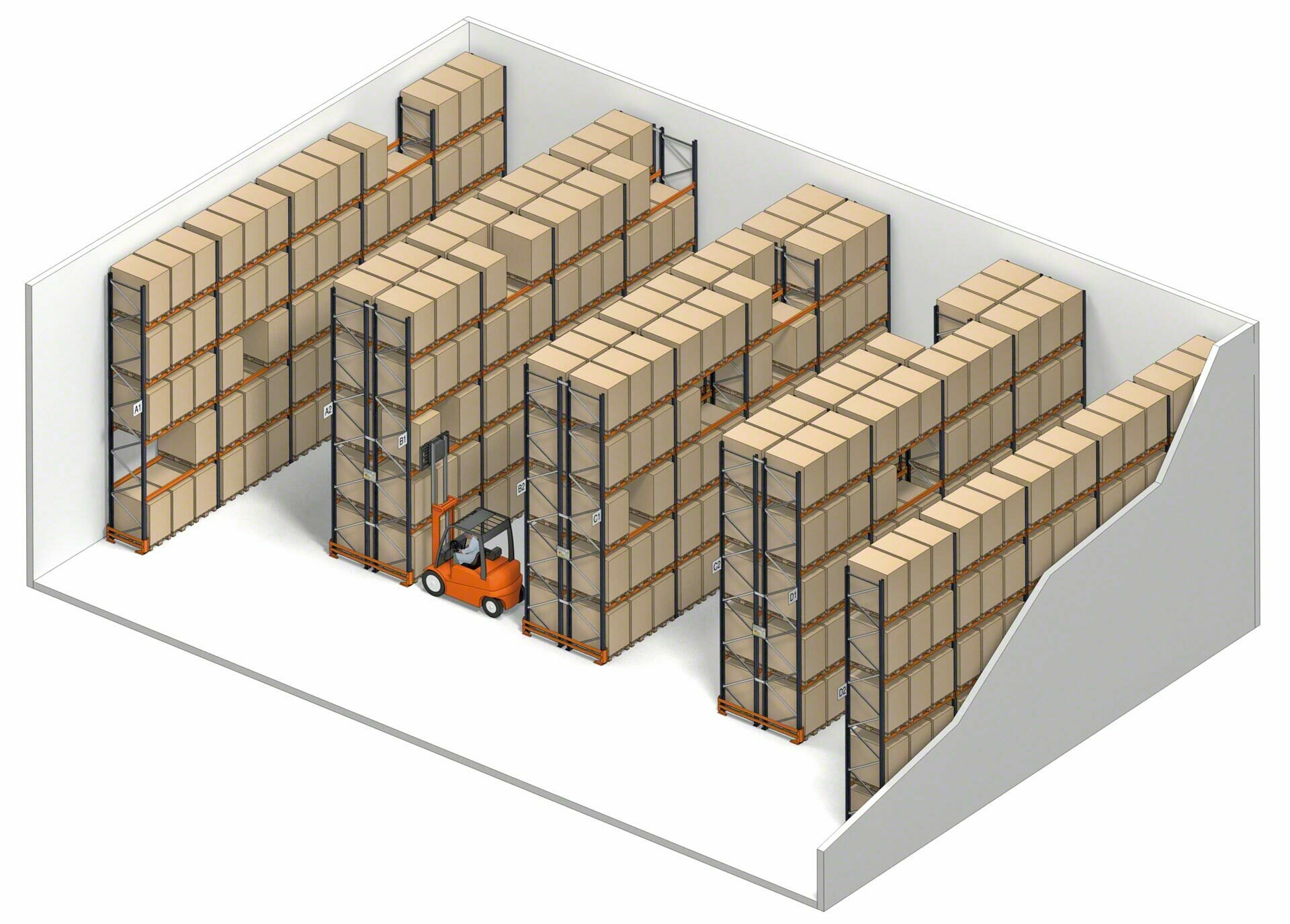 Tous type de chariots élévateurs (à contrepoids, à mât rétractable, tridirectionnel, etc.) peut être utilisé, à condition que l’allée ait une largeur appropriée et que les engins puissent atteindre les niveaux de charge les plus hauts. Dans le cas des rayonnages à double profondeur, le chariot élévateur doit être équipé de fourches télescopiques pour pouvoir atteindre la palette la plus éloignée.