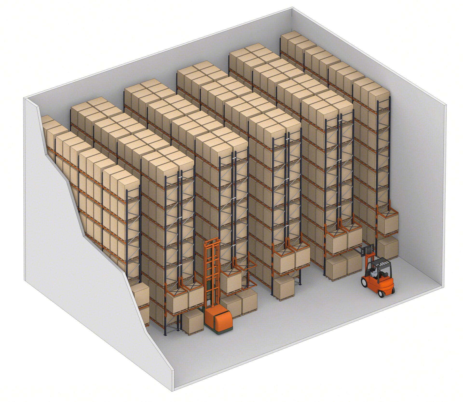 Tous type de chariots élévateurs (à contrepoids, à mât rétractable, tridirectionnel, etc.) peut être utilisé, à condition que l’allée ait une largeur appropriée et que les engins puissent atteindre les niveaux de charge les plus hauts. Dans le cas des rayonnages à double profondeur, le chariot élévateur doit être équipé de fourches télescopiques pour pouvoir atteindre la palette la plus éloignée.