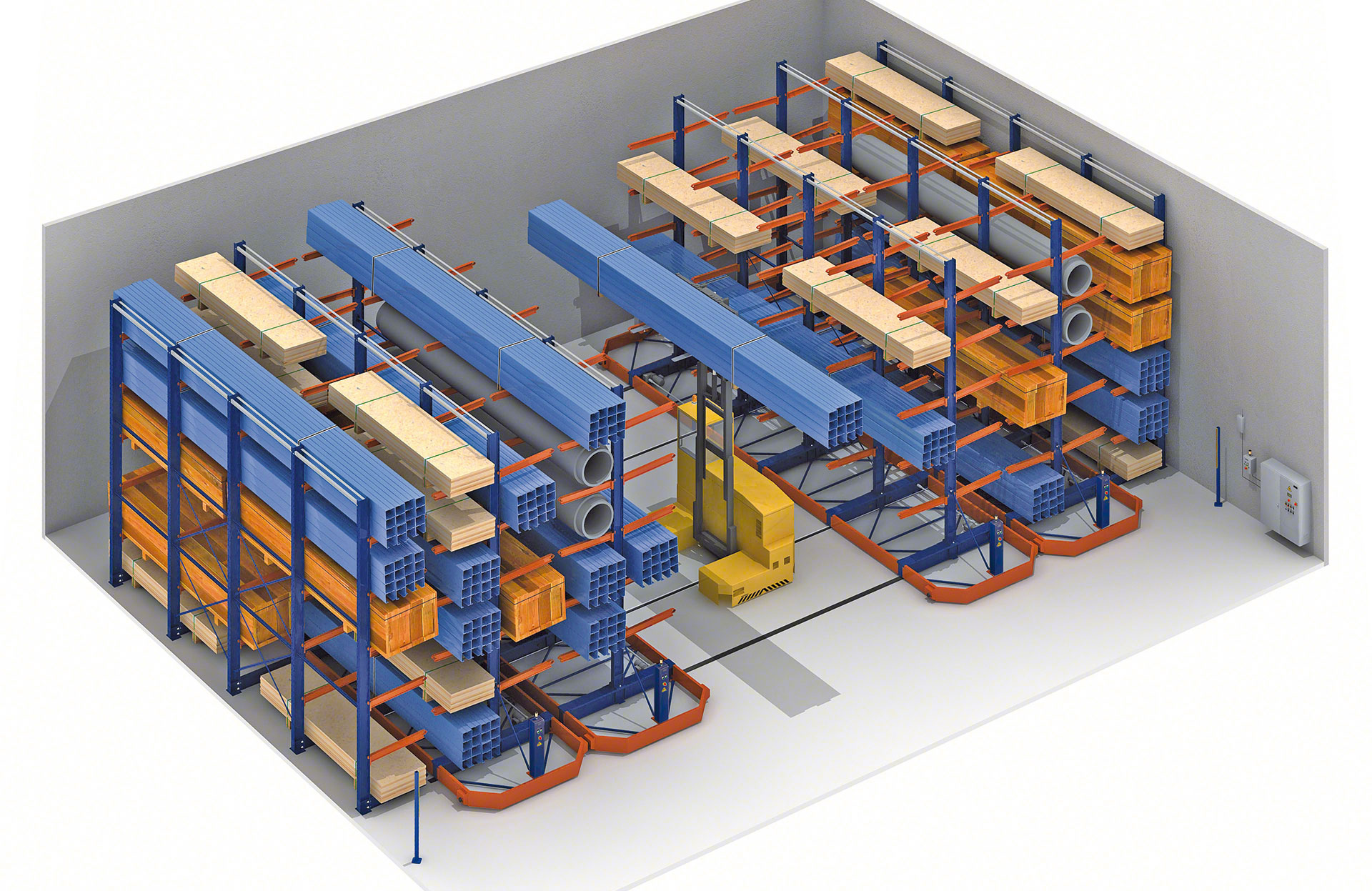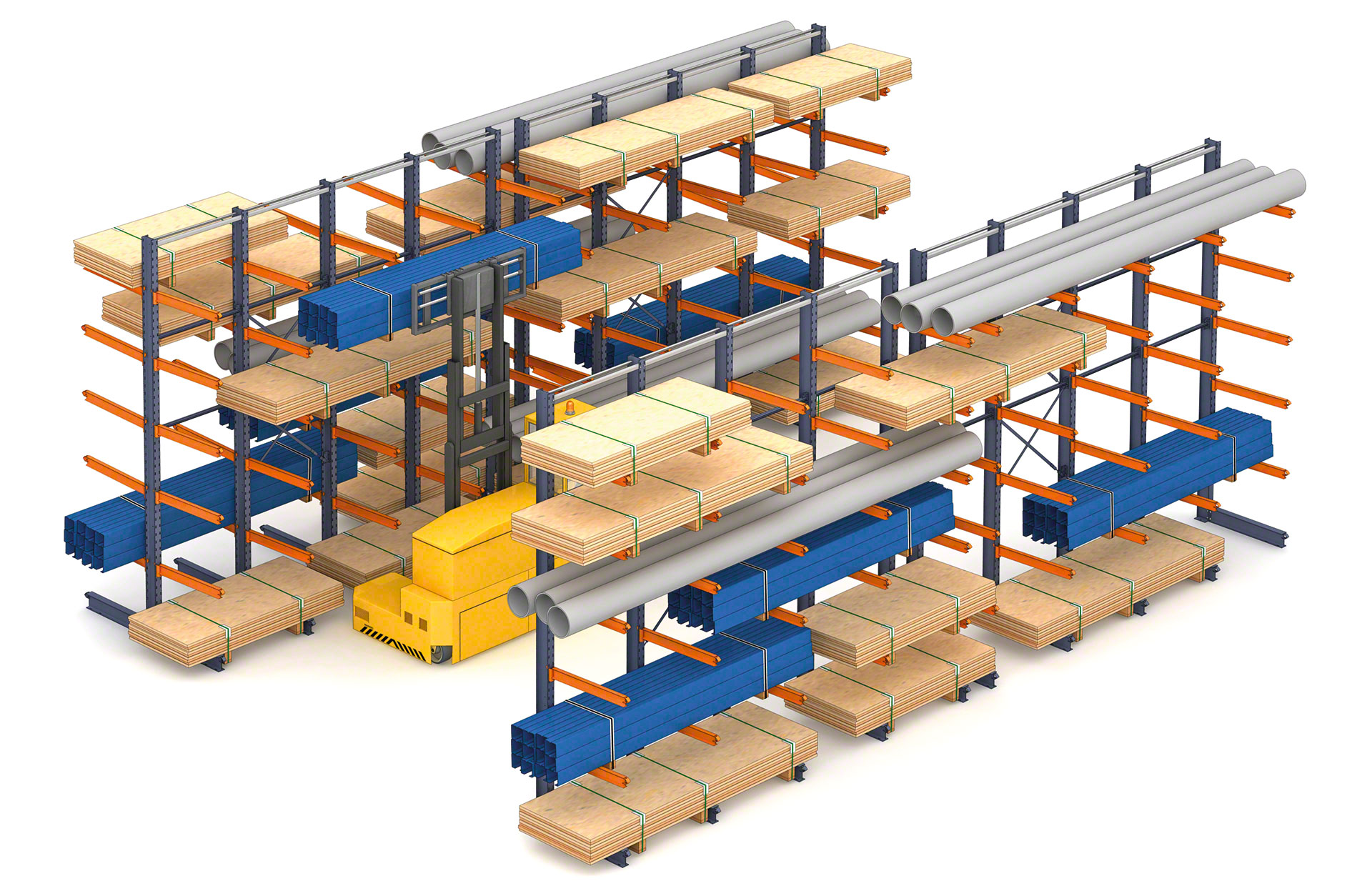 Le rayonnage cantilever est conçu pour stocker des unités de charge longues et volumineuses, telles que des profilés métalliques, des tuyaux en plastique ou des panneaux en bois. Ce système offre un accès direct à vos marchandises, facilitant ainsi leur manutention manuelle (pour les charges légères) ou à l’aide d’équipements de manutention (pour les charges lourdes).
