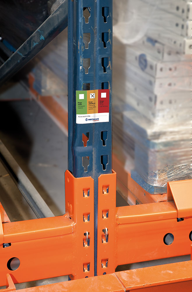 Lors des inspections de Mecalux, l’état général des rayonnages sera évalué et les parties éventuellement endommagées seront identifiées au moyen d’étiquettes autocollantes.