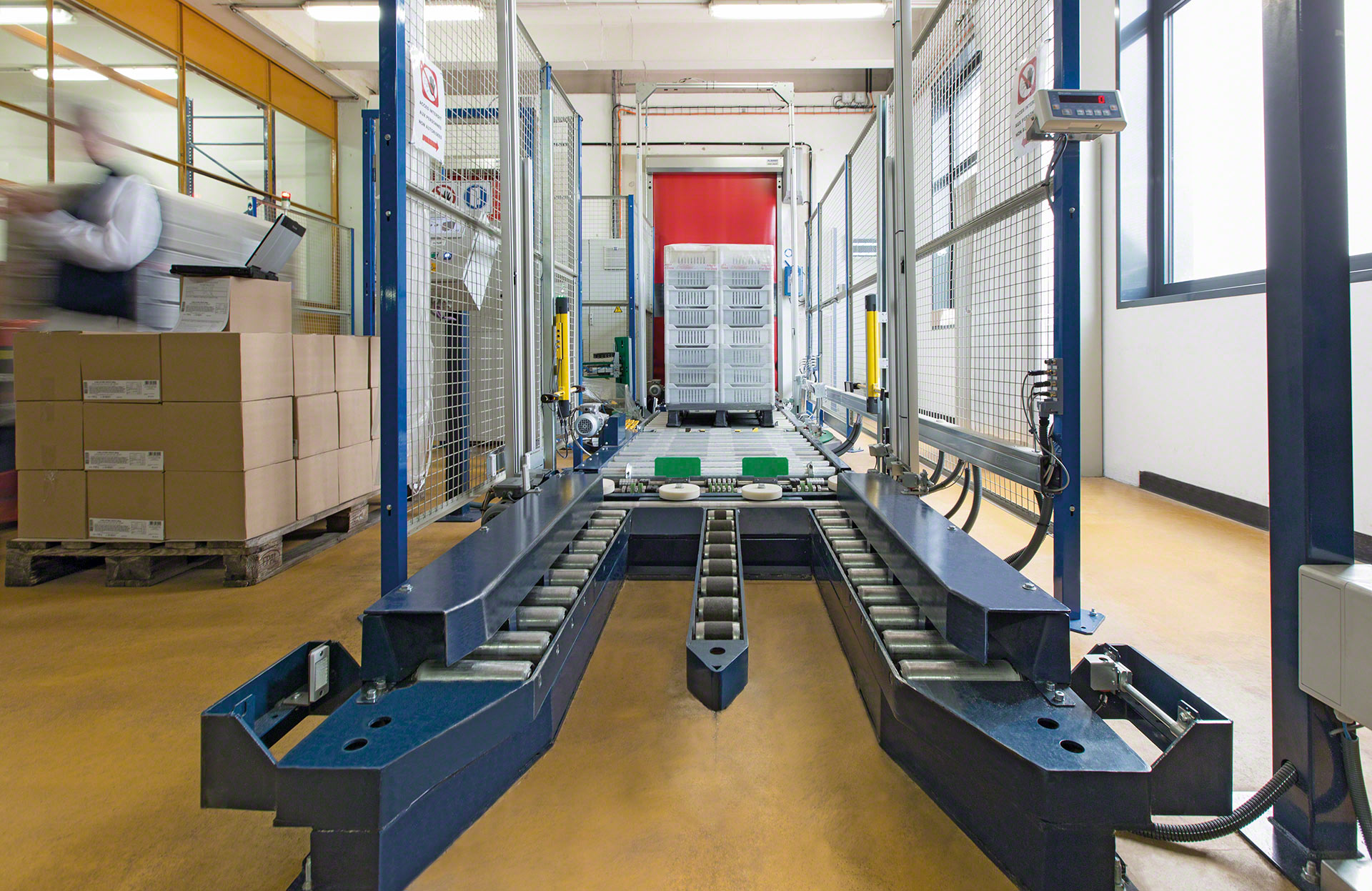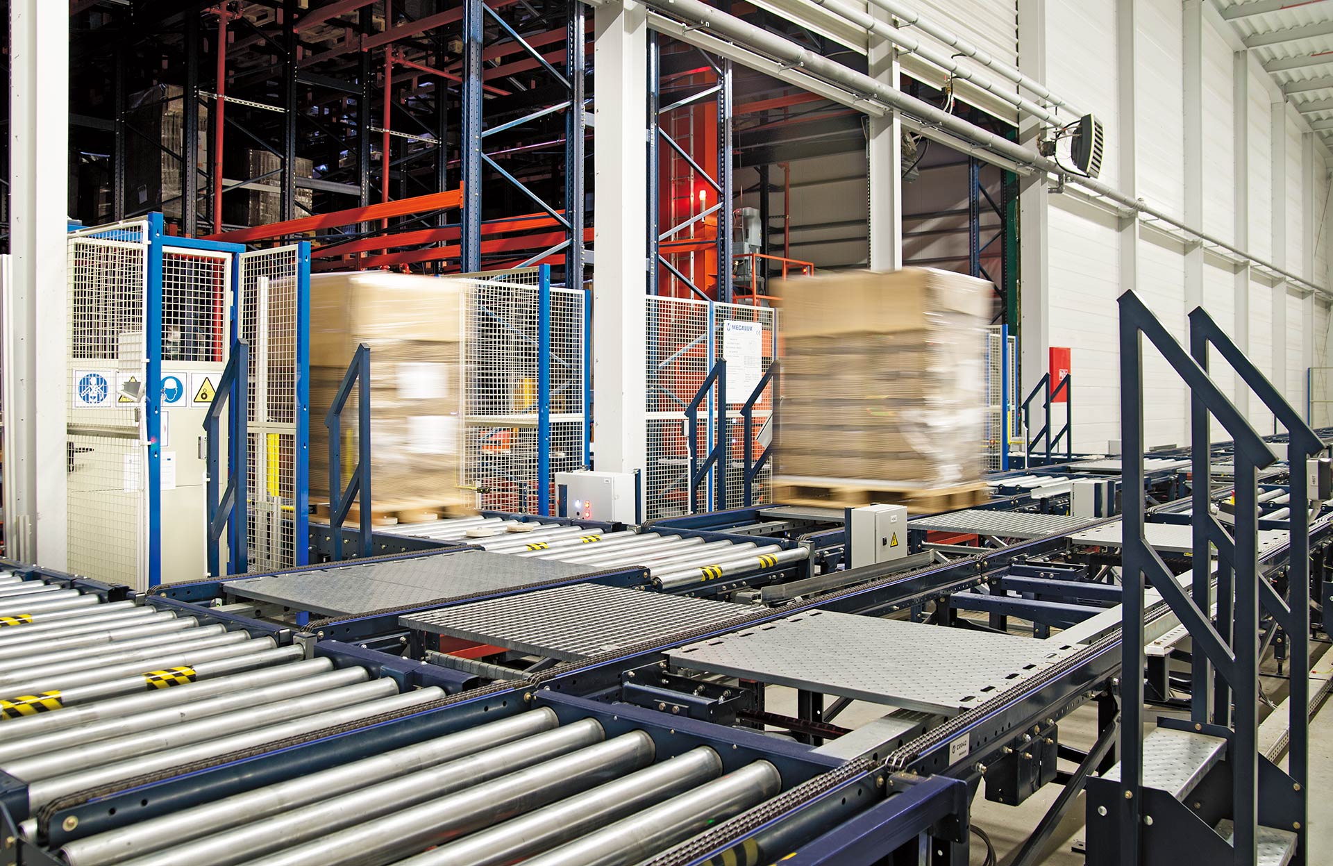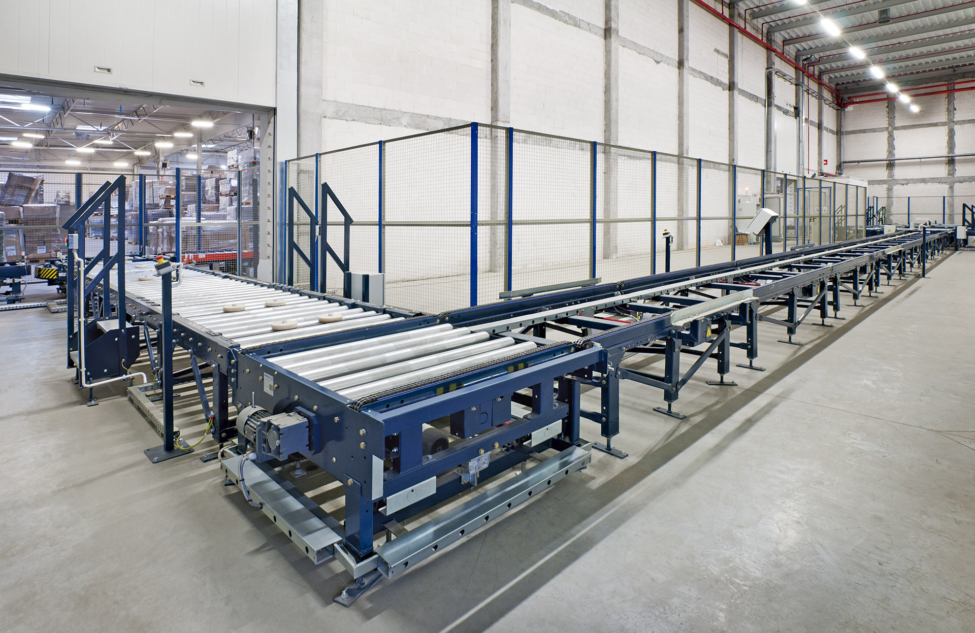 Les circuits de convoyeurs à rouleaux sont sécurisés par des grillages périphériques délimitant les zones à risque pour éviter les accidents, ainsi que par d’autres éléments et dispositifs garantissant l’intégrité des unités de charge et de l’installation.