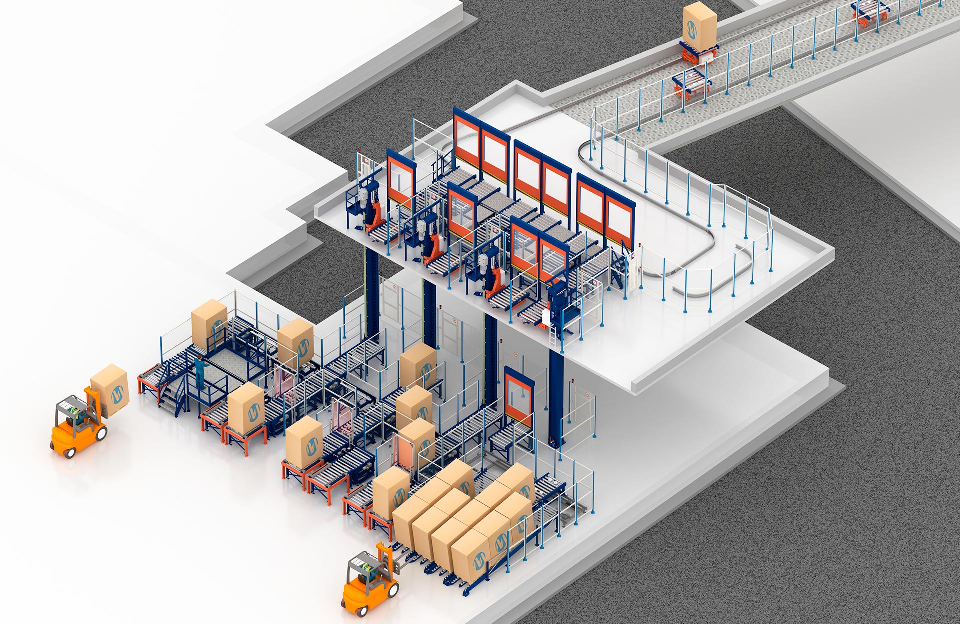 Dans les systèmes de stockage automatisés qui nécessitent des élévateurs, tels que le Pallet Shuttle avec navettes ou le Pallet Shuttle 3D, deux élévateurs sont généralement installés, l’un pour les entrées et l’autre pour les sorties. Toutefois, si l’installation nécessite davantage de cycles/heure, il est possible d’installer deux élévateurs d’entrée et deux élévateurs de sortie.