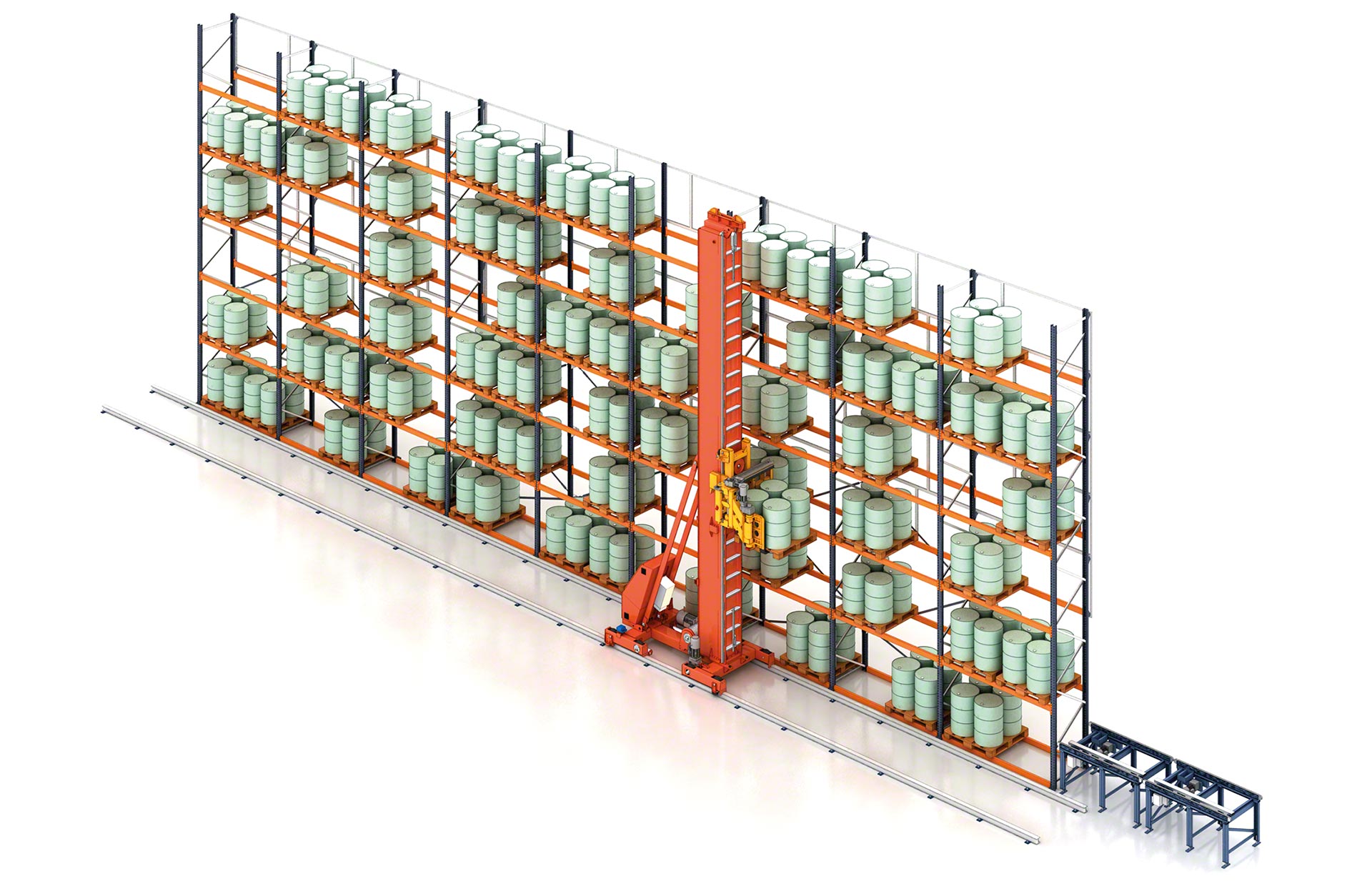 - Automatisation totale : la combinaison d’un transtockeur tridirectionnel avec un circuit de convoyeurs offre une gestion entièrement automatisée de vos charges palettisées.